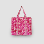 Este bolso trae la magia del block print tradicional de la India a tus proyectos de tejido. Es amplio, resistente y liviano: perfecto para llevar tus lanas, avances y cuadernos de notas donde vayas.