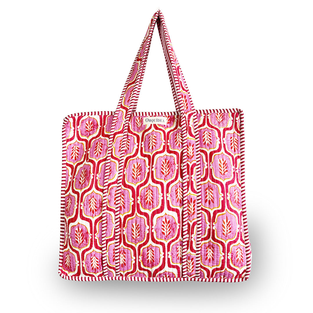 Este bolso trae la magia del block print tradicional de la India a tus proyectos de tejido. Es amplio, resistente y liviano: perfecto para llevar tus lanas, avances y cuadernos de notas donde vayas.