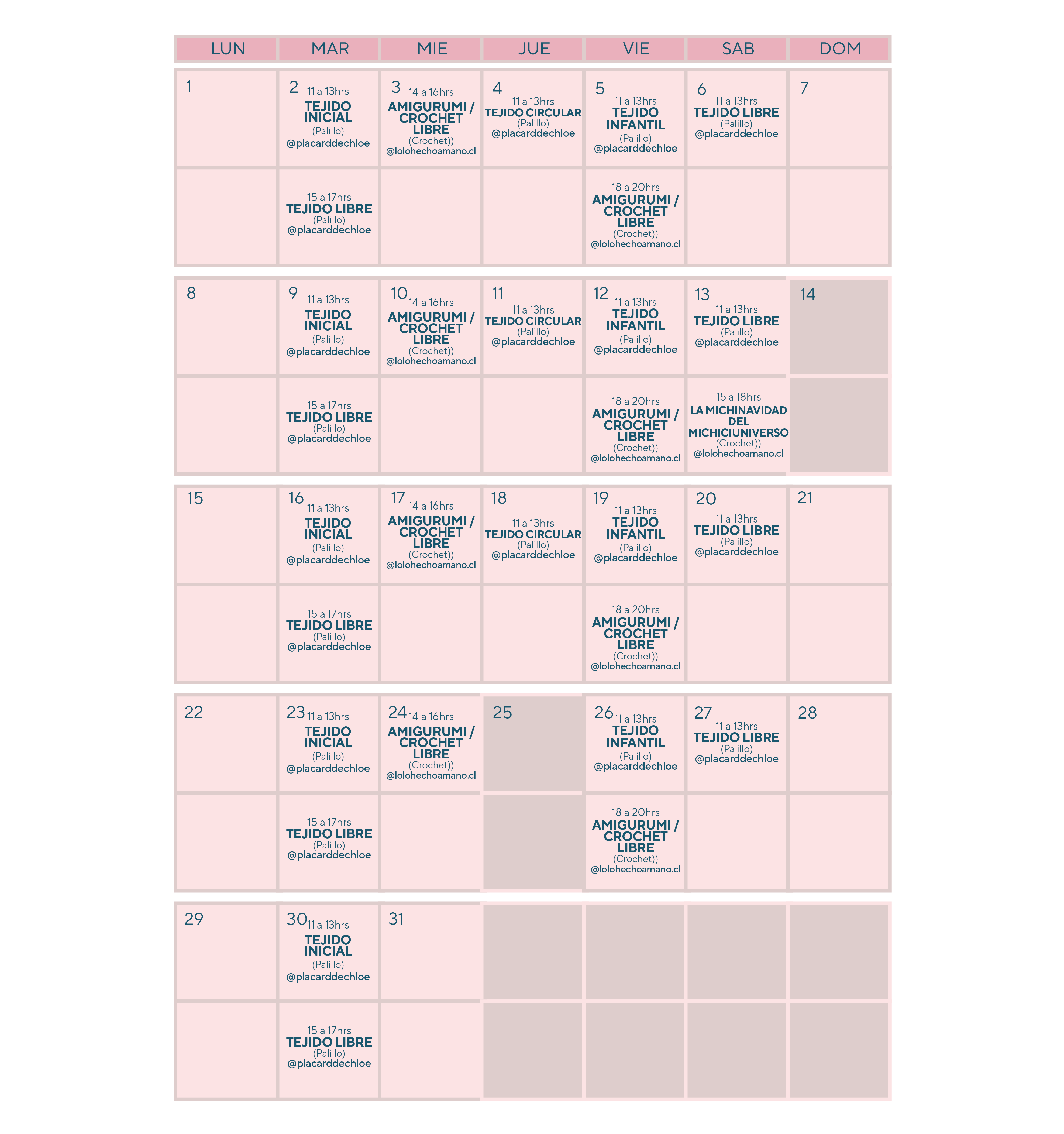 Más información e inscripciones con cada profesora en el instagram o mail señalado en el calendario.